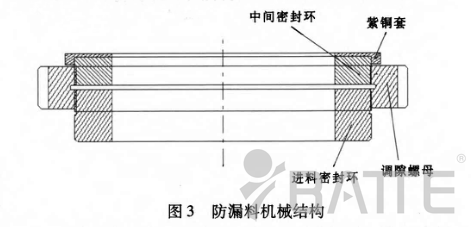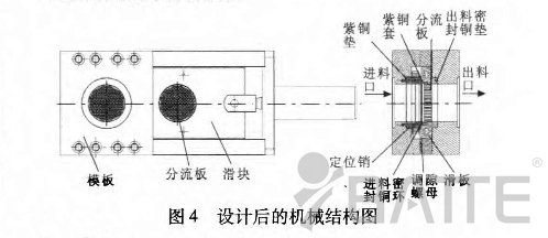 其中調隙螺母內部螺紋分左螺紋和右螺紋,和進料密封環聯接的是左螺紋,和中間密封環聯接的是右螺紋。當調隙螺母順時針放置時,進料密封環和中間密封環將向兩側移動,為提高兩側的密封性,分別在進料密封外端處加紫銅墊,在中間密封環外端加紫銅套,由于紫銅比較軟,在對調隙螺母使壓的情況下,能更好地起到密封的作用。同時,為防止在調隙螺母旋轉時進料密封環和中間密封環發生同步旋轉或扭曲,特加入兩根定位銷,定位銷貫穿進料密封環和中間密封環,兩端分別與進料密封銅環放置槽銷孔和滑板上的銷槽相聯接。整體結構如圖4所示。另外,紫銅的膨脹系數較高,在受高溫情況下會產生熱膨脹,這樣能夠進一步改善密封效果,從而使漏料問題得到很好的解決。換網器廠家:m.jyauct.com